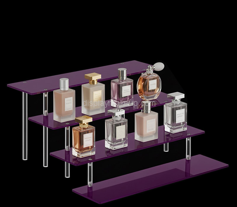 Custom acrylic 4-tier perfume display risers with clear legs and vibrant purple holders, offering a stylish way to elevate fragrance products for retail or showroom use. Delivered to your door with no extra costs across the US, Europe, and Asia.