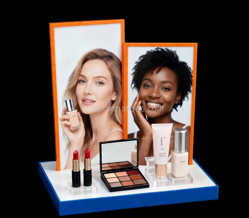 Custom acrylic blusher & lipgloss display prop with backboard pattern printing. Stylish and durable, colors and shape fully customizable to your needs. Wholesale only, perfect for retail and makeup showcases.