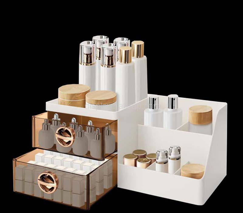 Custom white acrylic cosmetics organizer with translucent drawers, providing sleek, stylish, and functional storage for cosmetics. Durable, modern design perfect for retail displays or personal use. Available for wholesale only, offering bulk pricing for beauty businesses and stores.