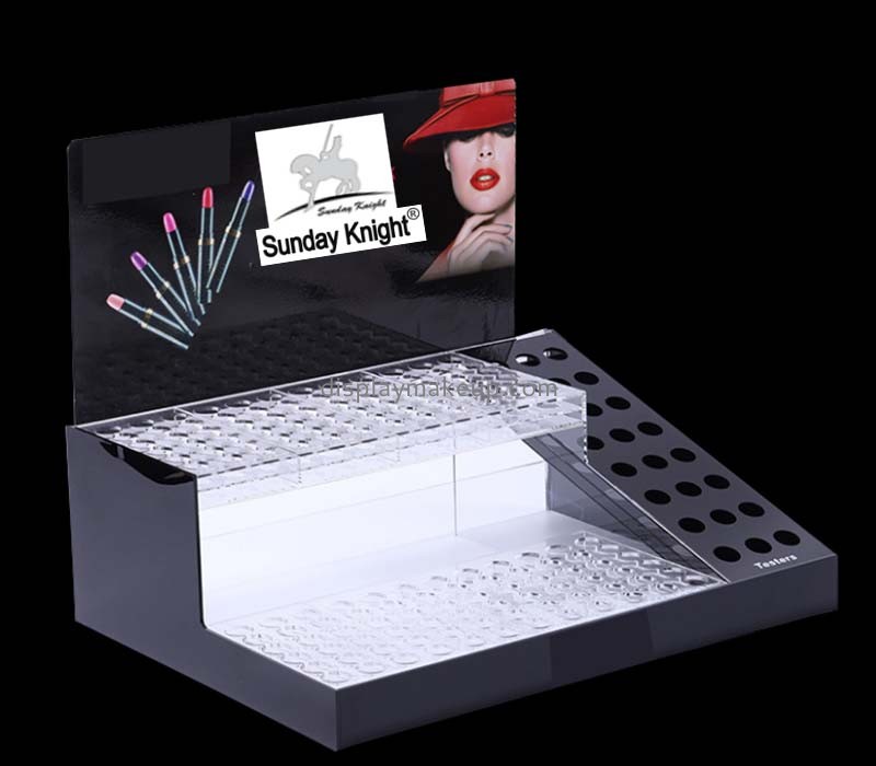 Introducing a bespoke black and clear acrylic countertop lip gloss display stand, meticulously crafted to enhance your product presentation. Combining sleek black accents with transparent clarity, this stand offers a striking contrast that highlights your lip gloss collection beautifully.