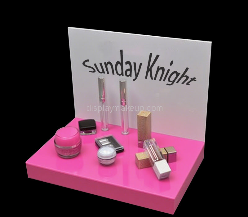 Custom acrylic retail beauty display stand holders with pink base and white backboard – A stylish and eye-catching solution for displaying beauty products. Crafted from durable acrylic for a clean, professional look. Enjoy door-to-door delivery with all taxes paid, making your purchase simple, seamless, and completely worry-free.