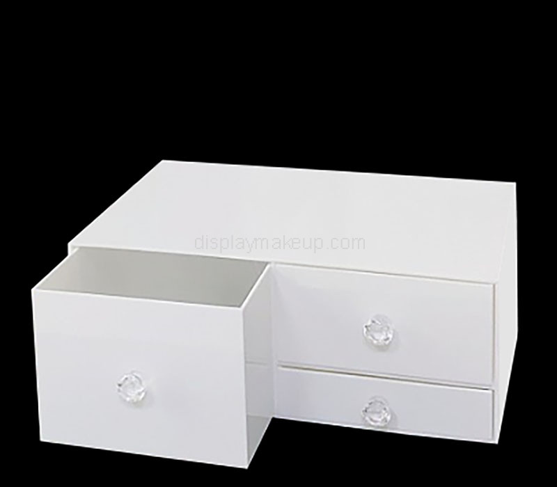 Elegant white acrylic organizer with 3 smooth drawers for skincare & beauty essentials. Minimalist design with durable construction. Custom sizing available. Bulk orders only—perfect for salons, spas & retailers. Contact for wholesale pricing.