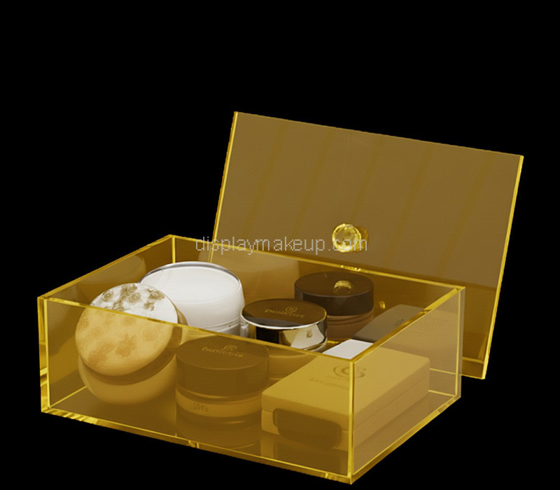 Custom translucent yellow acrylic skincare makeup storage box with lid features a bright, modern design and practical protection. Made from durable acrylic, it keeps cosmetics organized, visible, and dust-free. Ideal for vanities or retail displays, with smooth edges and customizable size, color, or logo options.