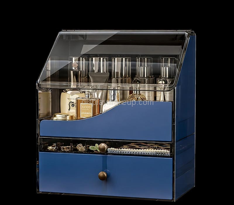 Custom blue and clear acrylic vanity cosmetics drawers organizer. Modern and elegant, it neatly stores makeup, brushes, and accessories while adding a stylish pop of color to your vanity. Functional design meets chic aesthetics for everyday convenience.