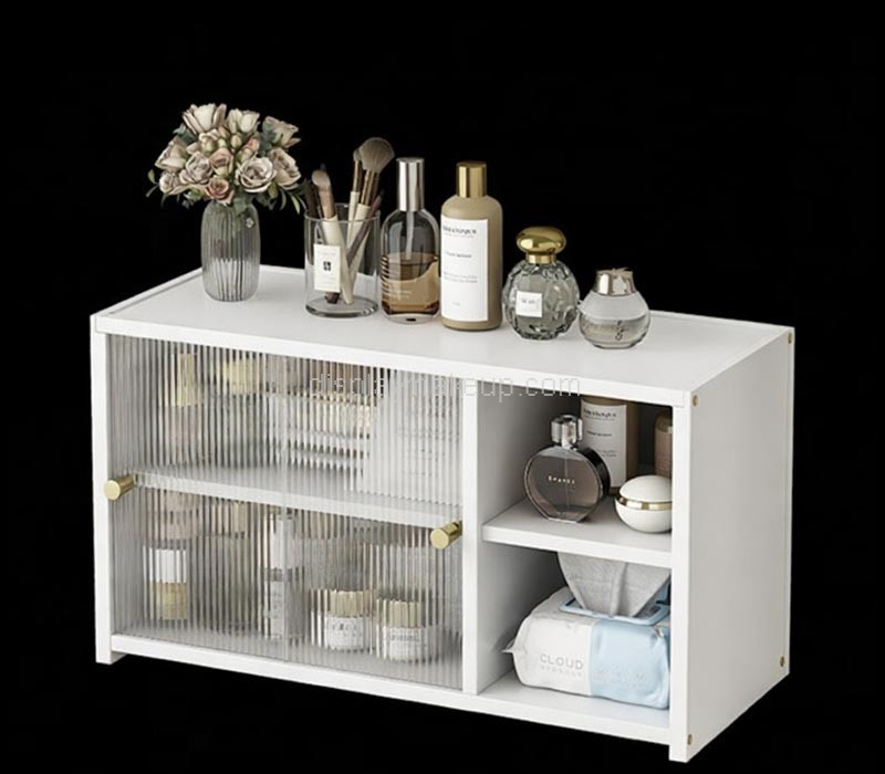 Custom white acrylic vanity organizer featuring elegant ribbed glass-effect sliding doors. Perfect for neatly storing makeup, brushes, and accessories, this stylish organizer combines modern design with functionality, adding a sophisticated touch to any vanity or dressing table.