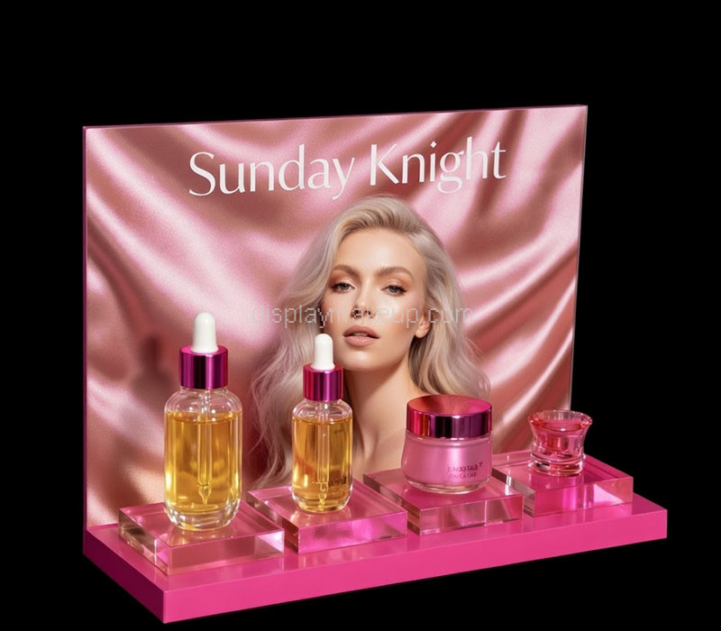 Custom plexiglass essential oils display prop with elegant backboard and pattern printing. Colors, shapes, and sizes fully customizable. Perfect for retail showcases and branding. Wholesale only.