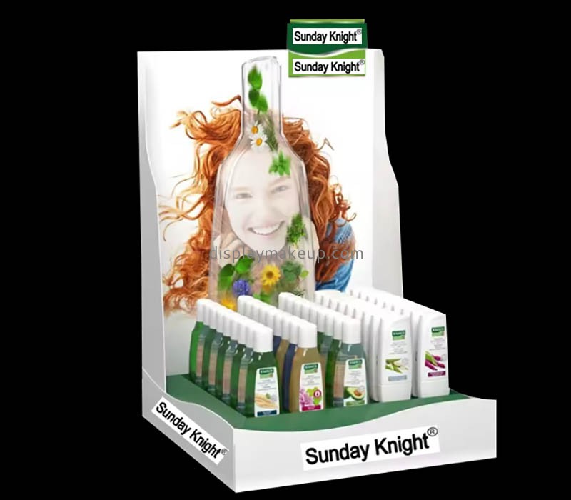 Our custom wholesale white acrylic hair care display props with backboard pattern printing are crafted to enhance the presentation of your hair care products. The clean white acrylic offers a modern and elegant backdrop, while the printed backboard adds a unique, eye-catching design element.